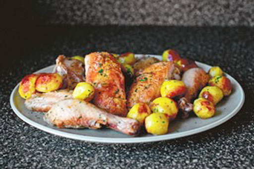 Roast the chicken for 30 to 45 minutes, or until a thermometer inserted into the thigh registers 165 degrees. Toss the potatoes after about 20 minutes, so that they cook evenly.