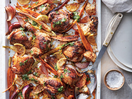 A bright citrus kick is just the thing for cold nights. This sheet pan supper gets a double dose from thin lemon slices roasted until tender, and fresh lemon juice added to a quick herb dressing that’s spooned over the finished dish. Sumac has a tart, lemony quality as well. It’s fantastic as a rub here, but is also delicious in vinaigrettes or sprinkled over dips. If you can’t find sumac, you can substitute 1 teaspoon grated lemon rind. If you want a little extra browning, pop the pan under the broiler for about 5 minutes, being careful not to let the vegetables get too dark.