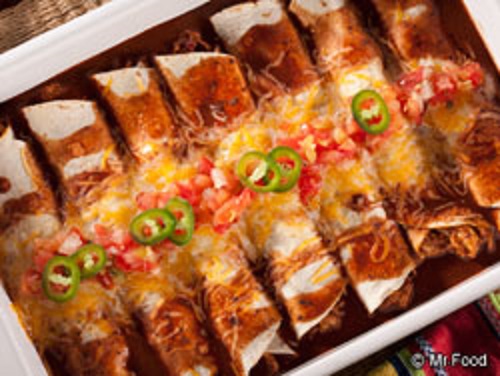 In a large bowl, combine chicken, 2 cups cheese, chipotle pepper, and 1 cup enchilada sauce mixture. Spoon chicken mixture down center of tortillas, distributing evenly; roll up.