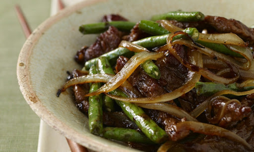 Heat 1 tablespoon oil in a wok or stir-fry pan over high heat until oil is hot but not smoking. Test by dipping a spatula in the beef mixture and then into the oil; it should sizzle. Add green beans and stir about 1 minute. Add water and reduce heat to medium. Cover and cook until tender-crisp, 6 to 9 minutes. Transfer beans and liquid to a shallow dish.