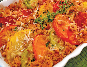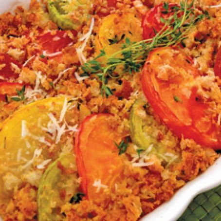 Scatter 1/2 the onion mixture over the bottom of prepared baking dish. Layer sliced tomatoes over the top slightly overlapping. Season with salt and pepper then repeat.