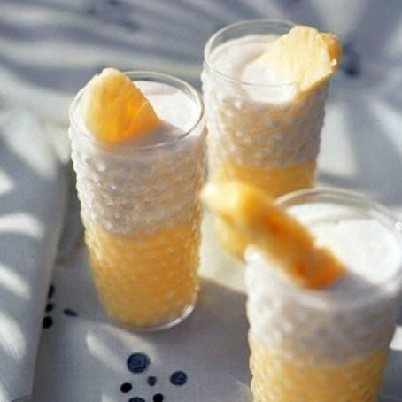 Combine all ingredients except garnish in a blender. Pour into tumblers, garnish with pineapple spears, and serve immediately.