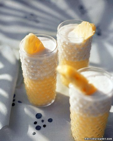 Combine all ingredients except garnish in a blender. Pour into tumblers, garnish with pineapple spears, and serve immediately