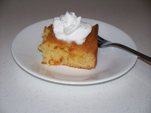 With fork, mix together cake mix, peach pie filling, eggs and oil. Gently add sour cream. Spread batter into a greased and floured 9x13-inch baking pan.