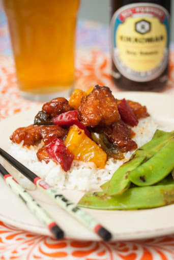 To prepare the sauce, combine all the ingredients in a medium sized bowl and whisk well to combine. Pour about 3/4 of the sauce over the chicken, peppers, and pineapple. Gently toss to combine.