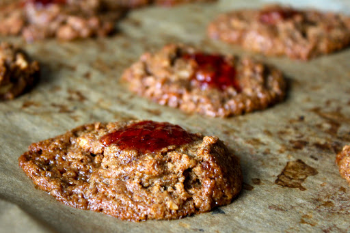 Drop about ¼ to ½ teaspoon of strawberry jam onto the top of each cookie.