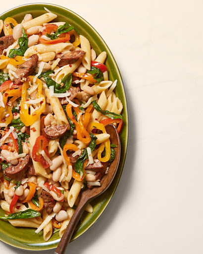 In the same skillet, heat the remaining 1 tbsp. oil over medium-high. Add the garlic, sweet peppers and crushed red pepper; cook, stirring often, until the vegetables soften slightly, about 2 minutes. Add the stock and bring to a boil. Cook until the liquid is reduced by about two-thirds, 4 to 5 minutes. Stir in the beans and sausage; cook, stirring often, until heated through, about 2 minutes. Add the spinach; cook, tossing, until wilted, 2 to 3 minutes. Add the pasta; cook until heated through, about 1 minute. Remove the pasta from the heat, stir in the cheese and season.