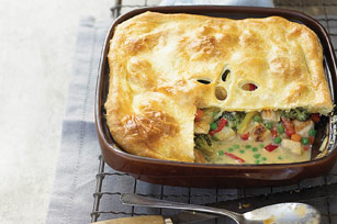 In a saute pan heat 1 tablespoon of butter and sweat the onion and celery. In another saucepan, heat the broth and milk. Add 2 more tablespoons of butter to the celery mix and cook out the water. Add the flour and curry and cook for 1 to 2 minutes. Whisk in the hot milk mixture and cook until thickened. Add the parsley, salt and pepper. Toss the browned vegetables and the chicken. Pour into a shallow baking pan, or a large terra cotta pot base, lined with foil, and top with 6 to 8 circles of puff pastry. Place into the oven and cook until puff pastry has browned and the mixture is hot and bubbly, about 25 minutes.