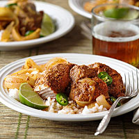 6. Transfer the ribs to a platter. If desired, use some of the banana leaves to line a serving platter; transfer ribs to lined platter. Discard the remaining banana leaves. Drizzle the ribs with some of the cooking juices. Serve with hot cooked rice, lime wedges, and cilantro.