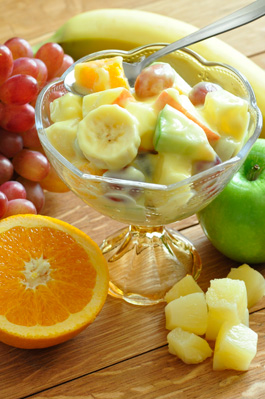 - 4 cups assorted fruit, fresh and/or canned: apples, bananas, oranges, grapes, pineapple