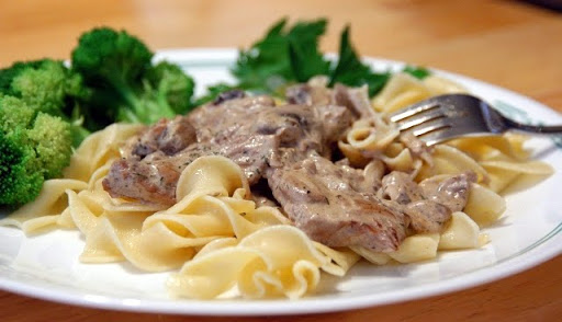Beef stroganoff recipe for the crockpot, with round steak and sour cream, along with mushrooms and other seasonings.