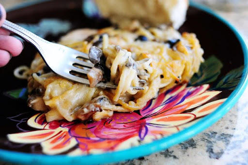 Add mushrooms, chicken, and chopped olives. Stir to combine and check seasonings. Add cooked spaghetti and stir.