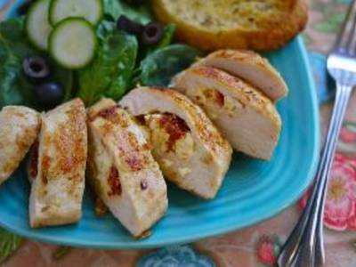 Combine the feta cheese, sun-dried tomatoes and olive oil to make the filling. Remove chicken from the marinade and fill the pocket with the feta cheese mixture. Use toothpicks to secure the edges of the filled pocket closed.