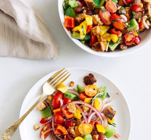 5. In a large bowl, add together all components: chopped vegetables, dressing, almonds, basil, and toasted bread. (If making in advance, add toasted bread, basil, and almonds last to avoid becoming soggy.) Best eaten about 20 minutes after assembling. Leftovers are delicious, but bread will become soggy after a few hours.