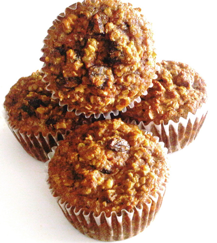 Combine oats, flax, coconut flour, sugar, baking soda, and spices. In separate bowl, mix together eggs, oil, water, and milk then add to dry mixture. Fold in carrot, apple, raisins (squeezing out excess liquid beforehand) and nuts.