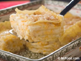 Place 3 noodles on bottom of prepared baking dish. Spread 1/3 of potato mixture over noodles. Repeat layers until a total of 4 layers of noodles and 3 layers of potato mixture have been placed (with a layer of noodles on top). Top with remaining sauteed onions.