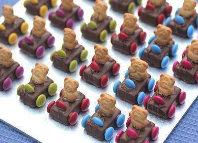 Glue each of the 4 wheels (smarties) on to the sides of the milky way bars. Press into each center a tiny teddy cookie. Glue on an m & m steering wheel for each one.