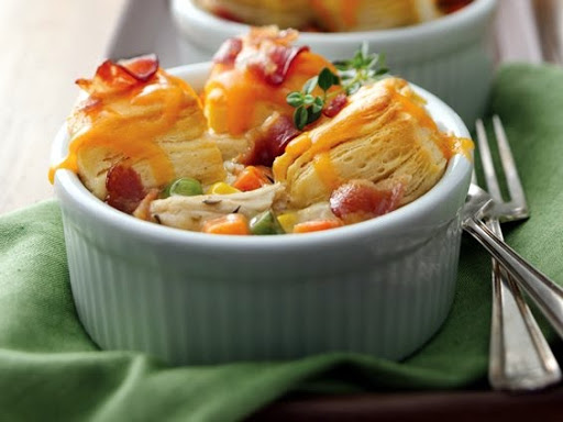 2. Separate dough into 5 biscuits; cut each biscuit into quarters. Set aside. In 3-quart saucepan, stir gravy and cornstarch with wire whisk. Stir in milk, thyme, pepper, chicken, vegetables and potatoes. Heat to boiling over medium-high heat, stirring occasionally. Immediately spoon about 1 cup hot chicken mixture into each ramekin; top each with 4 biscuit pieces.