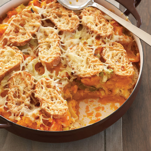 To assemble the gratin, preheat the oven to 400°. Bring the leek mixture to a boil. Spoon half of the squash into a 6- to 8-cup casserole. Ladle half of the leek mixture over the top and cover with half of the toast and half of the Gruyère. Repeat the layers with the remaining squash, leek mixture, toast and Gruyère. Sprinkle the Parmesan cheese over the top.