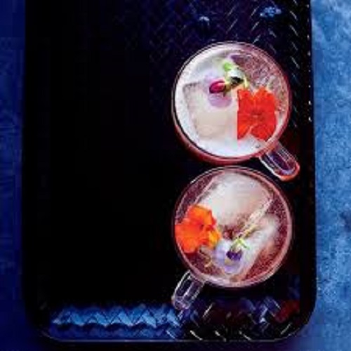 Place a few large ice cubes in a punch cup, and strain drink over ice. Top with Champagne and garnish with flower.