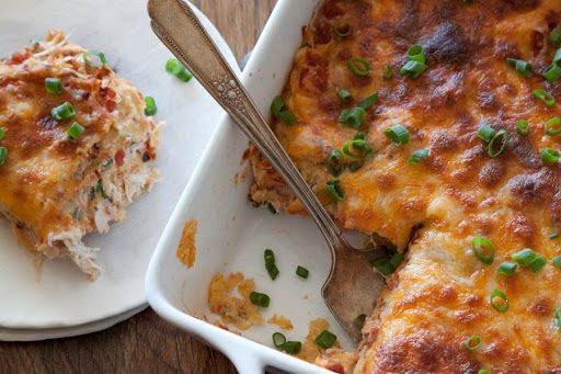 Spray a 7x11 baking dish with oil. Arrange half of the tortillas in the dish. Spread half of the chicken mixture on top of the tortillas, then sprinkle half of the cheese on top. Repeat this for a second layer.