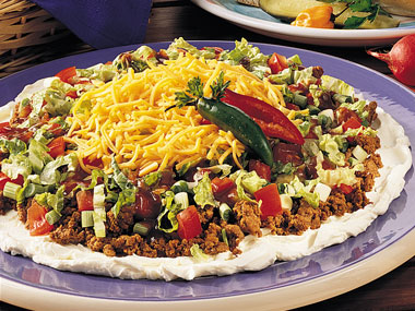In a large bowl, combine cream cheese and milk; spread on a 14-in. serving platter or pizza pan. Top with meat mixture. Sprinkle with chilies, tomatoes, onions and lettuce. Drizzle with barbecue sauce. Sprinkle with cheddar cheese. Serve with corn chips. Yield: 8-10 servings.