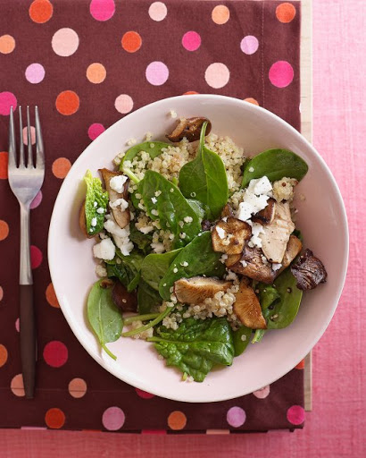 The quinoa adds protein as well as a chewy texture to this meatless main dish. The heat of the cooked quinoa and mushrooms helps wilt the spinach; the dressing and feta pulls this warm salad together.