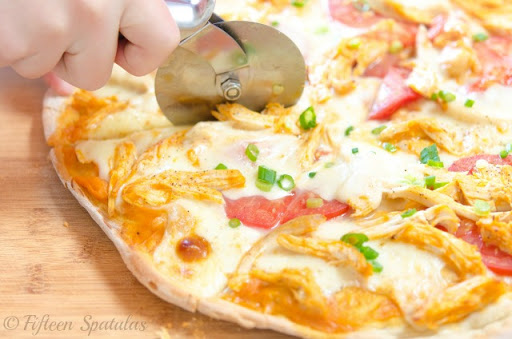 Add a few spoonfuls of the Frank's bechamel sauce you just made into the diced or shredded chicken, and toss to combine. Spread the remainder of the sauce all over your parbaked pizza crust (that just means you prebaked the crust for 10 minutes, if desired), then top with the cheese, sliced heirloom tomato, chicken, and onion, if you desire. Bake at 450 for another 10 minutes until the cheese has melted. Cut into slices and enjoy!
