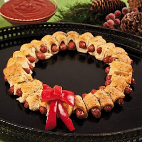 Place 1 half slice of cheese and 1 smoked sausage on each piece of dough. Roll up and press seam together. Place on cookie sheet with sides touching to make your wreath.