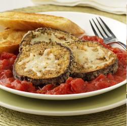 Meanwhile, combine undrained tomatoes and sauce in small saucepan. Bring to a boil over medium-high heat. Reduce heat to medium-low; simmer 10 minutes or until slightly thickened. Spoon tomato mixture evenly into 4 shallow bowls. Place 3 eggplant slices over sauce in each bowl.