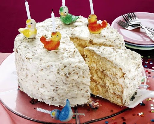 Preheat oven to 350°. Grease and flour three 9-inch cake pans and set aside. In a large bowl, cream together the sugar, shortening and butter until light and fluffy. Add the egg yolks, one at a time, mixing well after each addition. In a separate bowl, mix the flour with the salt. In another bowl, mix the baking soda with the buttermilk. Add the flour mixture alternately with the buttermilk mixture to the creamed mixture, beginning and ending with flour. Mix well. Stir in the VANILLA and coconut (Maggie also adds the nuts at this point but we thought they would look nice mixed in with the frosting). In a metal bowl, beat the egg whites until stiff. Gently fold the egg whites into the batter. Pour the batter into the cake pans and bake at 350° for 25 minutes. Cool for 10 minutes in the pans and then remove from the pans to cool thoroughly before frosting.