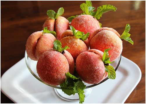Once the cookies have dried, you can insert a couple of mint leaves and a whole clove to resemble a peach.