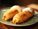 Cut the 2 layered sheets of phyllo lengthwise to create 2 long strips. Place a well-rounded tablespoon of the filling about 2 inches from the end of the dough strip.
