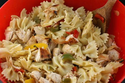Put pasta in a large bowl and top with chicken. Pour pepper sauce mixture over the noodles. Toss until everything is well coated. Add salt and pepper to taste. Add more milk if mixture is too dry.