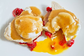 5.Place the eggs on top of the turkey, cover with gravy and a dollop of cranberry sauce.
