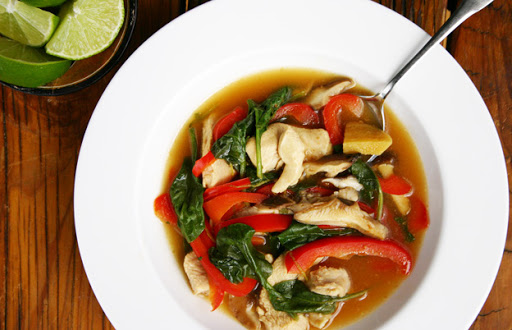 Combine the broth, tamari, chili paste, lime juice and ginger in a large pot and boil 5 minutes. Meanwhile, toss the chicken with arrowroot powder until completely coated. Add the chicken and mushrooms to the broth and simmer 15 minutes. Remove the pan from the heat and stir in the spinach, red pepper, zest, and cilantro. Let the soup stand 2 to 3 minutes before serving.