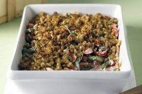 SPOON into greased 13x9-inch baking dish. Prepare stuffing mix as directed on package; spoon evenly over vegetable mixture.