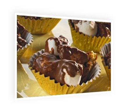 2.Stir in marshmallows and graham cracker pieces until well coated. Drop by spoonfuls into miniature paper muffin cups (1-3/4 inches in diameter). Cover; refrigerate until firm.