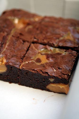 Drop one-third of the Dulce de Leche, evenly spaced, over the brownie batter, then drag a knife through to swirl it slightly. Spread the remaining brownie batter over, then drop spoonfuls of the remaining Dulce de Leche in dollops over the top of the brownie batter. Use a knife to swirl the Dulce de Leche slightly.