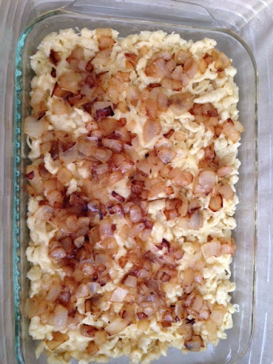Chop up a medium onion. Heat 3 tablespoons of butter and saute onions until browned. Pour over the spaetzle.