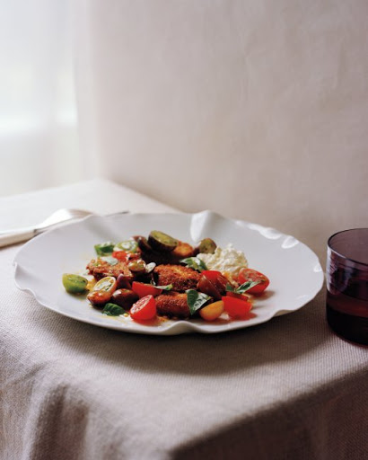 Tomatoes with Crisp Fried Eggplant and Burrata