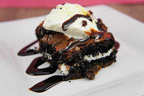 4. Cover with foil and bake for 30 minutes. Remove foil and continue baking for an additional 15-25 minutes. Brownies are down when a toothpick inserted 2″ from the edge comes out clean or with moist pieces clinging to it. Let cool completely before cutting and serve with vanilla ice cream.