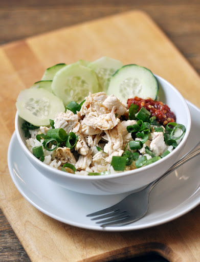 It's a pure, simple meal: Chicken poached with garlic and ginger, then shredded. The light, ginger-scented chicken broth is used to cook rice, and then the chicken and rice are served with a sprinkle of scallions and cilantro, and a drizzle of sesame oil.