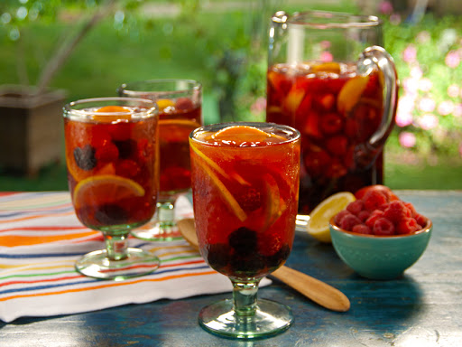 Combine the wine, lemonade, liqueur, blackberries, raspberries, nectarines, lemons and oranges in a large pitcher.