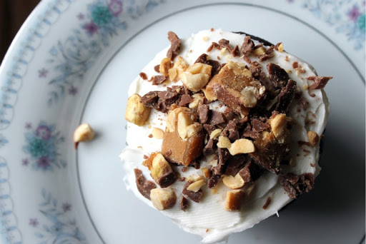 Chop up some Baby Ruth’s. Pour batter into the cupcake lined pan about 1/2 way full, then place a nugget of Baby Ruth into the middle of the batter. Pour batter over the nugget until cupcake tin is 3/4 way full. Bake for 18 minutes or until toothpick test comes out clean. Cool, then frost and top with Baby Ruth crumbles.