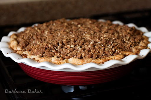 Sprinkle the chilled crumble topping evenly over the custard filling, then return the pie to the oven to bake an additional 15 minutes, until the crumble is golden brown.