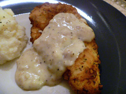 For the pepper gravy cook garlic in same saute pan over medium-high heat until fragrant, about 1 minute. Whisk in 3 Tbsp. flour and 1 1/2 tsp pepper; slowly whisk in milk. Boil gravy, whisking constantly, until thick, 2-3 minutes. Stir in 1 tsp thyme.