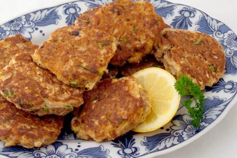 Place all ingredients in a bowl and mix well together. Form into patties and cook in skillet with olive oil turning to brown on each side.