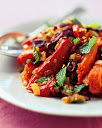 Heat oil in a large skillet over medium heat. Add onion and cook, stirring frequently until tender, about 10 minutes. Add garlic, paprika, red pepper flakes, and saffron, and cook 2 minutes. Add peppers, vinegar, and olives. Season with salt and pepper, reduce heat to low, and cook another 3 minutes. Stir in mint. Serve.