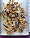 Heat broiler. Slice eggplant into 3/4-inch-thick rounds; cut each round into 3/4-inch-wide strips. Transfer to a broiler-proof rimmed baking sheet; toss with coarse salt and ground pepper.